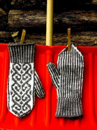 Celebrate winter and all it offers knitters in the North! Prepare for the next big storm or meditate on winter landscapes while following this pattern’s vertical direction: due north. Due North requires stranded knitting techniques and knits up tightly with natural colored yarns at 6 sts to an inch on #3 (3.25mm) double pointed needles. Requiring only 200-300 yards of yarn in 3 colors for women’s mitten, this small project offers the intermediate knitter a lot of warmth and a bit of mental stimulation. The palm is worked in vertical stripes while the back of the hand features a Turkish ram’s horn pattern, inspired by Anna Zilboorg’s book, Simply Socks. These mittens consistently use 2 colors per round; it’s a great opportunity to practice two handed knitting. The sample mittens are knit in the three natural colors of Green Mountain Green, an environmentally conscious blend of fine wool and mohair produced by Green Mountain Spinnery.
