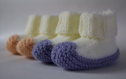 The booties are based on the Little Duffers slipper pattern (but adapted for knitting only, no felting) and have a contrast colour Garter stitch sole which curls up around the toes.