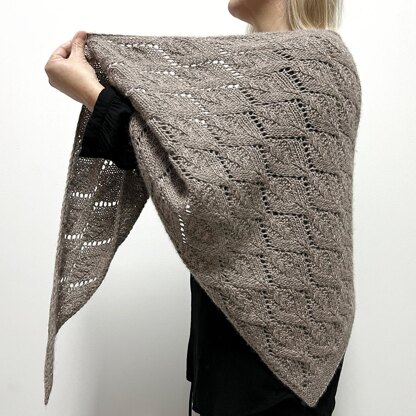 'Dune Path' is inspired by the evanescent prints left in the sand as people walk to and fro between land and shore. This asymmetrical but nearly triangular shawl uses a combination of cables and geometric lace to produce an unusual pattern of lines and curves that open and close in a soothing rhythm.