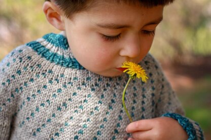 When it came time to name this pattern, I settled on Dust Devil—perfect for the spiraling design on the yoke, and the kids that wear it, always in motion, whether on the run or just spinning in circles as kids do. The spiraling design on the top-down circular yoke is created with slipped stitches, which creates a thinner fabric than traditional stranded knitting because you’re only carrying a single strand of yarn behind your work—perfect for warmer weather and busy kids! The contrast color is carried through the piece with stripes at the cuff and hems, and a notched collar to accommodate big kid noggins finishes it off.