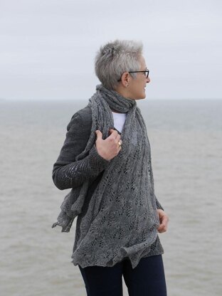 A pretty, swirling stitch pattern rises in columns along the length of this airy scarf or stole in three sizes (petite/medium/tall) to add interest for a day outfit or drama with evening wear. Worked with basic lace stitches, the pattern carries the shading of a heathered yarn along its curvy lines; the movement is further accented by furrows of reverse stockinettte ribs to add depth. Overall, the pattern is simple to work with WS rows in knit and purl—it’s a great beginning lace project or good travel knitting for more experienced knitters. Substituting yarn and/or needles may result in an overall variation in size and drape.