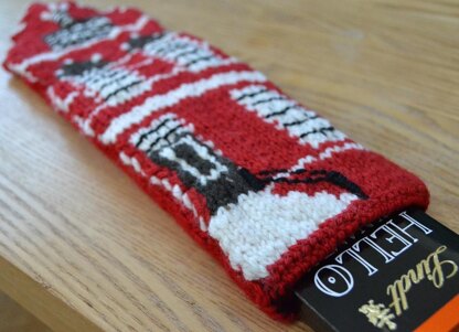 The house is knitted in red, cream and brown double knit wool. Some of the details like the black window frames and railings were embroidered on afterwards.