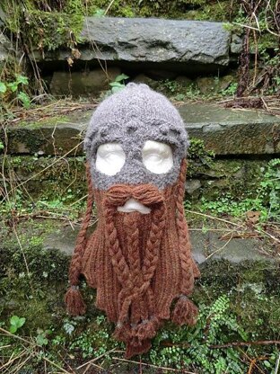 It is worked top down in the round, starting with the helmet which features a knotwork and rivet encrusted design and a 'spectacle' eye area. You then move straight into knitting the beard, and finish up by adding braids and moustaches to suit your taste.