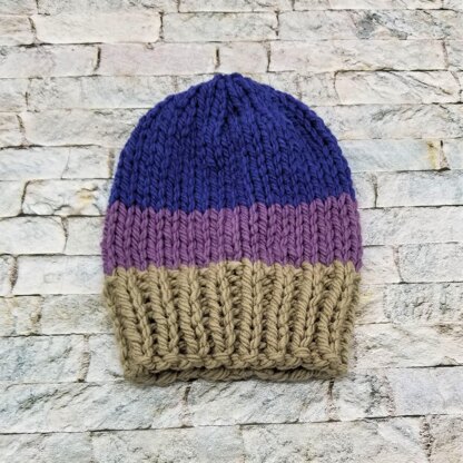 The Dysartsville Adult Hat Knitting Pattern is created with a unique three-color combination and 1 x 1 ribbing. It is a great way to use up scrap yarn and sparks your creative side thinking up unlimited color choices. It is a hat you will want to knit again and again.
