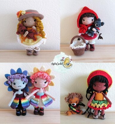 - English and French Patterns of the 5 dolls in crochet (size about 6 inch =>16 cm) : indications, photos, diagram and tips - All the clothes are removable. 2 sets of clothes for each doll - Pattern of little companions included - Articulated doll or not according to your preferences