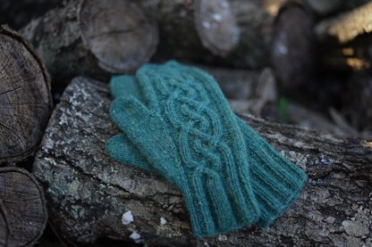 Feminine and fearlessly rugged, rich cabling runs down the back of these timeless mittens. Two-stitch cables travel to new levels of complexity, designed to satisfy the adventurous knitter; the right and left hands are worked as mirror images of each other. The cable pattern is charted only. Densely knit with a secure cuff and roomy hand, these mittens are the perfect companion to a chilly day. Wear them alone, or make an Eahlswith Hat to match. Named for Ealhswith of Mercia, wife of Alfred the Great. (Sample shown in Peace Fleece DK in color Kamchatka Sea Moss.)