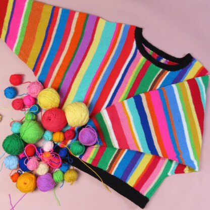 This loose bat-wing jumper is the ultimate stashbuster, as even small lengths of yarn can be used and in any colour combinations you choose! The jumper is worked flat in one piece, working from cuff to cuff on a circular needle to accommodate the number of stitches. Techniques include knit and purl stitches, increases and decreases, simple stripe colour changes, working in the round (neckband), and picking up stitches.
