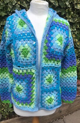 The squares are joined as you go, so there’s no seaming afterwards. The sleeves are worked in the round downwards from the shoulder to the cuff. The hood is worked upwards in one piece and there’s a short seam to close the top of the hood. This seam is worked in ss and can’t be seen, even when the hood is down. This pattern is great for using up yarn scraps.
