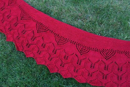 The shawl is worked bottom-up with a lace section worked first, then transitioning through a short mesh insertion to garter stitch short-rows which form the crescent shape.