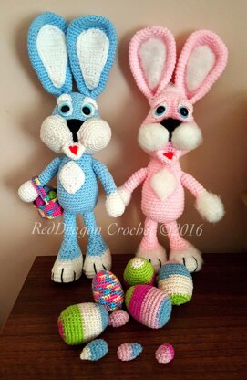 The pattern is written with a dk yarn, 60g blue and or pink, 20g white, and the bunny stands 15inches tall. They are a bundle of fun to make and are ready to search for easter eggs.