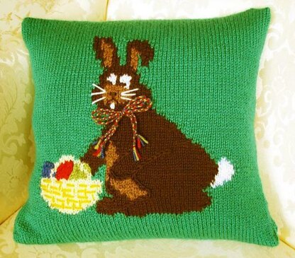 This cushion cover is worked using the Intarsia method to depict an Easter Bunny with his basket of eggs.
