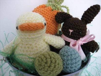 These Amigurumi Easter toy patterns are super easy, and use little amounts of yarn. The set includes instructions to make the following: Drawstring Carrot Treat Bag Amigurumi Chocolate Bunny doll Amigurumi Duck doll Robin's Eggs and Nest toy