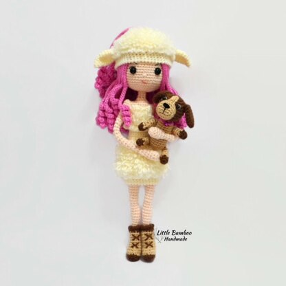Written in English using US terminology. Materials: • 4 Ply Fingering Acrylic / Milk Cotton Yarn - Light peach - White - Magenta - Camel brown - Beige - Dark brown • Fiberfill or cotton • Crochet hook size 2 mm • Wire • Black eye 9 mm ( 2 ), 5 mm ( 2 ) • 5 mm button ( 3 ) • 7 mm pink bell Skill level: INTERMEDIATE