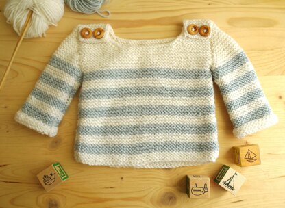 An easy knitting pattern for a very stylish baby jumper. This breton jumper with button details can be knitted striped or plain and makes a great gift for a new baby.