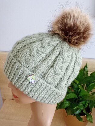 Knitting pattern instructions to make a lovely brimmed, fairly easy cabled hat in Chunky weight yarn. Knitted on straight needles size 5mm (UK6) and 6mm (UK4) plus a cable needle. This is my own design and will fit an adult size head. It has stretch so will fit most heads and is suitable for a man or a woman (unisex) I used King Cole Value Chunky yarn, but you can use any chunky yarn of your choice which requires 5mm and 6mm needles. It took 1 x 100g ball of yarn and I added a faux fur pom pom. If you require a pom pom in the same yarn, please buy extra. Can be worn with or without a pom pom and you can make your hat unique by adding a pretty button etc.. Enjoy your project.