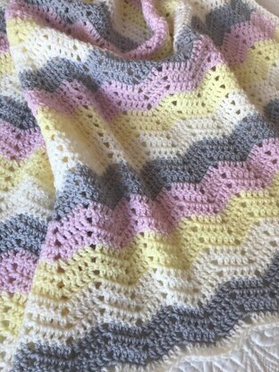 The "Easy Chevron Blanket" crochet pattern is written in UK terms and is suitable for a beginner crocheter.