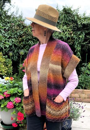An eye-catching gilet with set-in pockets. The lower part is worked in a raised, alternating, textured pattern, and the deep borders are moss stitch. This design not only has style but is a super useful wardrobe addition. Worked bottom up and with full written instructions.