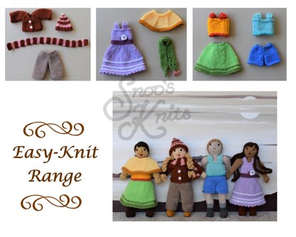 This is the Easy-Knit clothing range for the Snoo's Knits Dress-Up Doll. The clothes are simple and relaxing to knit and you can personalise them with trimmings afterwards.