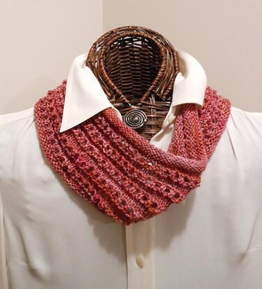 Easy eyelet knit; easy weekend project; easily adaptable to a wider, longer "never-ending" version. One 200-yard skein is sufficient for project as shown; a yarn that drapes well is preferred, for purposes (duh) of pretty draping!