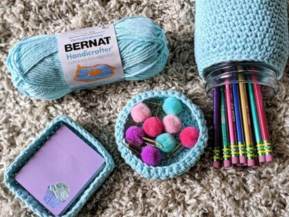 The Easy Peasy Desk Set pattern is the perfect way to add a little something to a Home Office! Featuring a Mason Jar Cozy, a paper clip bowl, and a Sticky Note Holder! Make all three pieces using only one skein of Bernat Handicrafter. I could also see this set on a craft table with crochet hooks in the jar, stitch markers in the bowl, and maybe my measuring tap in the holder. ❤️