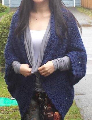 A super fast, easy to make shrug that is very versatile to wear in spring or fall. Featuring eyelet rows throughout the body, accented with pretty shell edging throughout neckline to back as well as the sleeves. Pattern is written for multiple sizes with 3 length option.