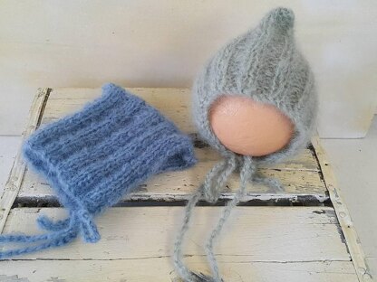 Darling little Baby Bonnet pattern for you to make yourself. The bonnet is knits up in 0-3 months and 6 months sizes, great as a photo-prop. Simple ribbed stitch, quick and easy to make