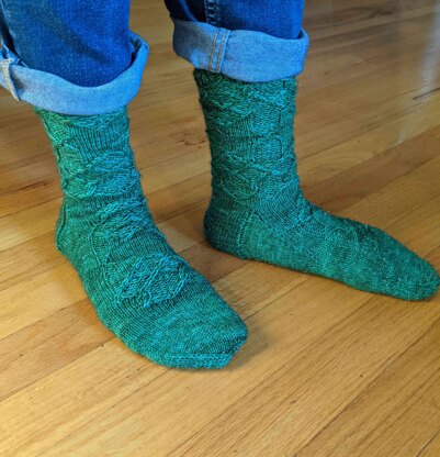 Ebla socks are top-down with twist stitch stars in a diamond and hexagon latice, heel flap, round heel, gussets, twist stitch instep and short toe. Lattices in the round have the same problem as stripes that jog, but there are notes in the written instructions for dealing with that.