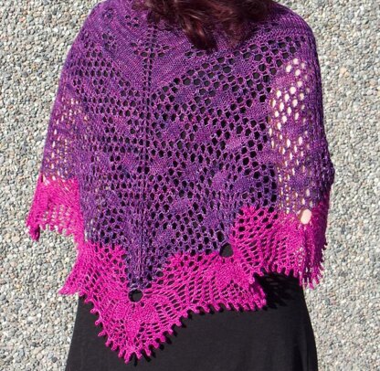 The shawl is knit from the top down, and can consist of 2, 3, or 4 triangular sections. Two sections makes a triangular shawl notched at the top to sit on your neck. Three sections makes an enveloping shawl with a square notch at the top. Four sections makes a square shape, open on one of the diagonals, again with a notch at the top.