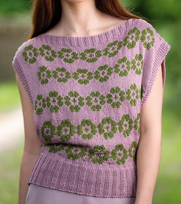This modern summer sweater gives a nod to classic styles from the pre-war era. Created from two essentially square-shaped pieces, the top has a wide neckline and armhole openings, and features a nostalgic flower motif. It uses Lang Artemis, a mix of cotton and silk that knits up into a sleek fabric with a lovely drape; it’s available in a range of sophisticated shades.