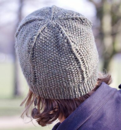 This quick hat was inspired by a sea urchin shell in the Paris Museum of Natural History. Sea urchins are members of the order Echinoida, which are characterised, in part, by exhibiting five-fold symmetry. Under their spiny exteriors, sea urchin shells have a rough pebbly texture that reminds me of seed stitch, which makes up the body of this hat. Five equally spaced columns of ribbing mimic the symmetry of the adult urchin and provide the perfect vertical line for hiding the crown decreases. Pattern is charted. Sample shown was worked in Knit Picks Wool of the Andes in Pampas Heather.