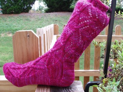 This is a lace sock that can be knit from the toe up or from the cuff down, with a slip stitch heel. There are 2 sizes. Small is a 60 stitch leg, Medium is a 66 stitch leg. There is an option to do the toe in an eye of partridge stitch.