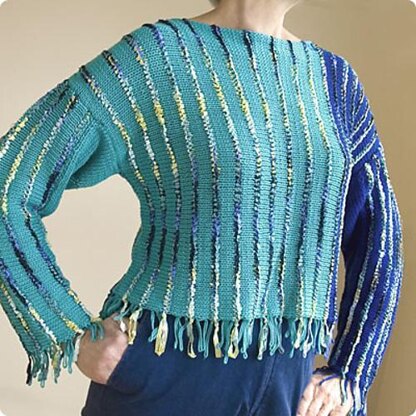 The body is knit sideways and the bottom edge is fringed when the knitting is complete. The sleeves are knit sideways with a conventional vertical gusset to make shaping easy.