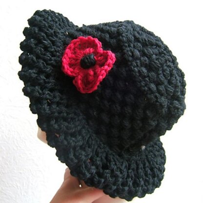 This hat is fun, chic and stylish. The wide brim gives a touch of glamour to those chilly days. The fabric stretches so it will fit all size adult heads. The poppy is a very simple crochet technique and is optional. You can also attach a very small safety pin to the back and use the poppy as a broach.