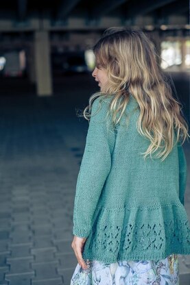 Edla Volang Kofta ist ein süßer, schlichter Cardigan im nordischen Stil, für kleine und und große Mädchen. Die elegante Raglanlinie und die rückwärtige Rüsche mit integriertem Ajourmuster sorgen für das gewisse Etwas und jede menge Strickspaß.