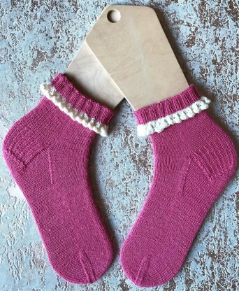 The socks in the collection are knitted from the top down using a standard heel flap and gusset construction. The ruffled frill and first half of the turned-back cuff are knitted first, then inverted using a short row before knitting the rest of the sock. The foot length of the socks is adjustable to fit.