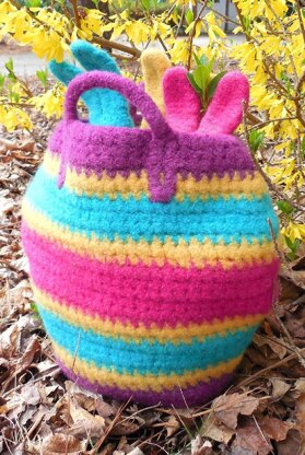 The perfect cross between basket and tote, this egg shaped carryall is essential for the big hunt! Felted “dough bunnies" make up quickly with the leftover yarns.