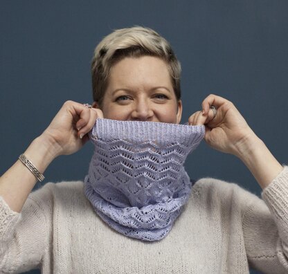 Named after the word for flight in Welsh, Ehediad is a simple lace cowl, worked in the round. The cowl begins with a deep border of twisted rib, which transitions into lace chevrons and then into a series of patterns inspired by birds in flight.