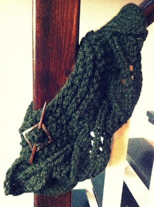 This is a cowl or mini shawl, knit from Artesano Superchunky yarn. The leafy lace edging is knit first on ten mm needles and cast off. Then the rest of the mini shawl is made by picking up and knitting along the lace border and knitting in garter stitch, decreasing to create the mini shawlâs horse shoe shape. It is held closed with a shawl pin. Its modelled here by my 8 year old, and looks cute as a shawl. On an adult it is more of a cosy cowl.