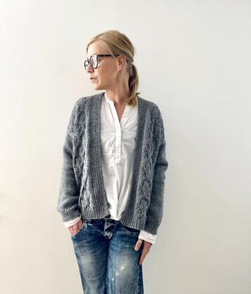 Elah is worked seamlessly from the top down. Fronts are worked in lace pattern, while the back is worked in Stockinette stitch. Knitting starts with the provisional cast on of the shoulders for the fronts. Once the short row shaped shoulder slope is done, the front is worked flat to underarm. Shoulder stitches are picked up from the provisional CO of both front shoulders to work the back to the same length. At underarm both fronts and back are joined to work the body top down back and forth to the bottom hem. Sleeve stitches are picked up around the arm openings to work the sleeves in Stockinette stitch top down in rounds to the cuffs.