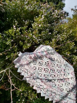 The Elain Shawl is inspired by the character, Elain. It is a simple, delicate, slightly ornate shawlette. The design focuses on the character's love of her garden but also her inner strength.