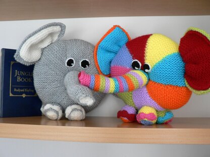 The single colour Elefun pictured above has been worked in Double Knit, using 75 grams Hayfield Bonus DK yarn in the main colour (shade 0814) plus an oddment of contrasting yarn. Both versions are knitted in several pieces on straight, single point needles & stitched together. The main body section is knitted in one piece, using short rows to shape the sections. An Elefun worked in DK yarn stands approx 9 ins/23 cms tall & measures approx 8 ins/20 cms in diameter.