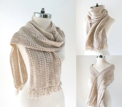 The Elegant Textured Scarf/Shawl with an array of eyelet style lace and various textures throughout the scarf/shawl that adds a classic essence with elegance to any wardrobe. A fingering weight yarn is used on this design. You can also wear this design as a small shawl or wrap it around your neck for a beautiful cozy scarf. Designed with a fingering/sock weight yarn perfect for any wardrobe. Make the Elegant Textured Scarf/Shawl in a merino wool, cashmere or wool blend perfect for fall and winter or a linen, cotton, silk blend for spring and summer. Various types of stitches and lace form this beautiful scarf/shawl accented with a fringe to finish the design. This will be a favourite scarf/shawl to wear for years to come with the contemporary essence and delicate movement of the stitches that form the lace effect.