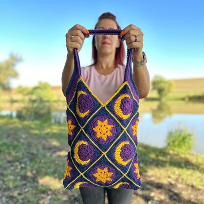 The Elenna Bag is a gorgeous bag made of celestial themed squares, perfect for advanced crocheters.
