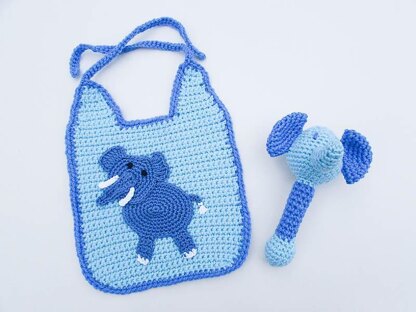 Adorably cute Elephant Baby Bib and Baby Rattle Pattern with Elephant Applique, very easy and quick to make with lots of pictures to help you along the way. Perfect gift for the perfect baby.