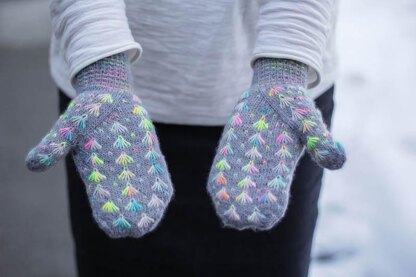 Knit in the round, from the cuff up. The pattern includes a chart of the whole mitts, and line by line instructions. Follow one, or use both. They use an unusual thumb gusset, with increases on one side. A slim fit makes these mittens very comfortable, you won’t feel like your fingers are swimming about in them or like they want to fall off.