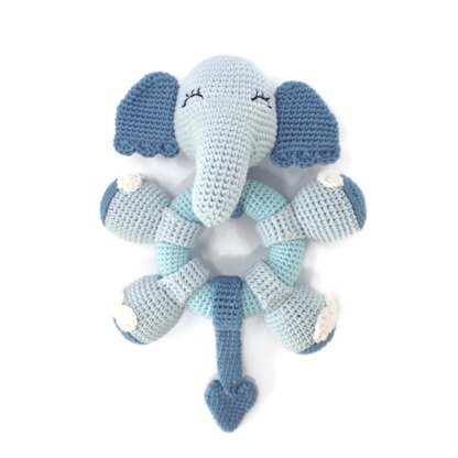 Using the materials suggested this elephant measures 18 cm (7 in). Any yarn can be used with this pattern with an appropriate size crochet hook to create a tight tension, although other yarns may affect the size of the finished toy. Suggested materials: DK (8ply) 100% cotton yarn, 2.5mm crochet hook, toy stuffing and a small toy rattle.