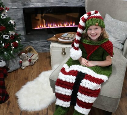 PDF digital download crochet pattern for Christmas Elf Cocoon Blanket & Hat. Hat sizing in toddler-mens, blanket in Child and Adult (Size Modification Tips included in pattern).