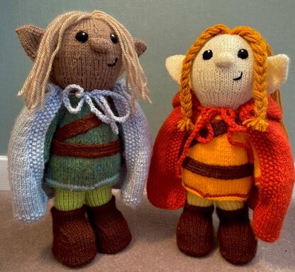 The two elves are made from the same pattern just using different coloured yarn. The yarn is 100% acrylic but any yarn could be used as long as it doesn't break too easily due to the shaping. The shaping of the feet at the beginning of the pattern is the trickiest part of the pattern and it gets easier after that. The arms are knitted from the armholes but could just be knitted separately and sewn on at the armholes. I have tried to reduce the amount of sewing to a minimum therefore the body and head are knitted as one piece.