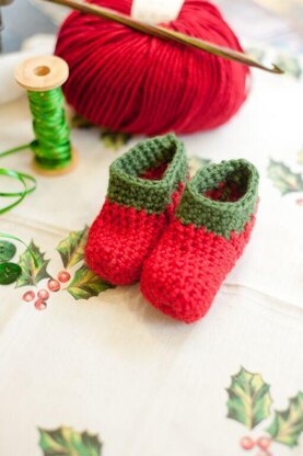 These cute little elfin shoes take less than an evening to make and are ideal to hang from a tree or to use in Christmas arrangements. They will also fit a newborn and can be made in larger sizes using the same pattern with an appropriate hook and thicker yarn (eg aran weight).
