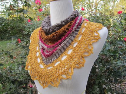 Ella is a multi-colored scarf to keep your neck warm this winter. It is full of interesting stitches and bordered with a jewelry-like edging. Ella is a quick project with striking results!